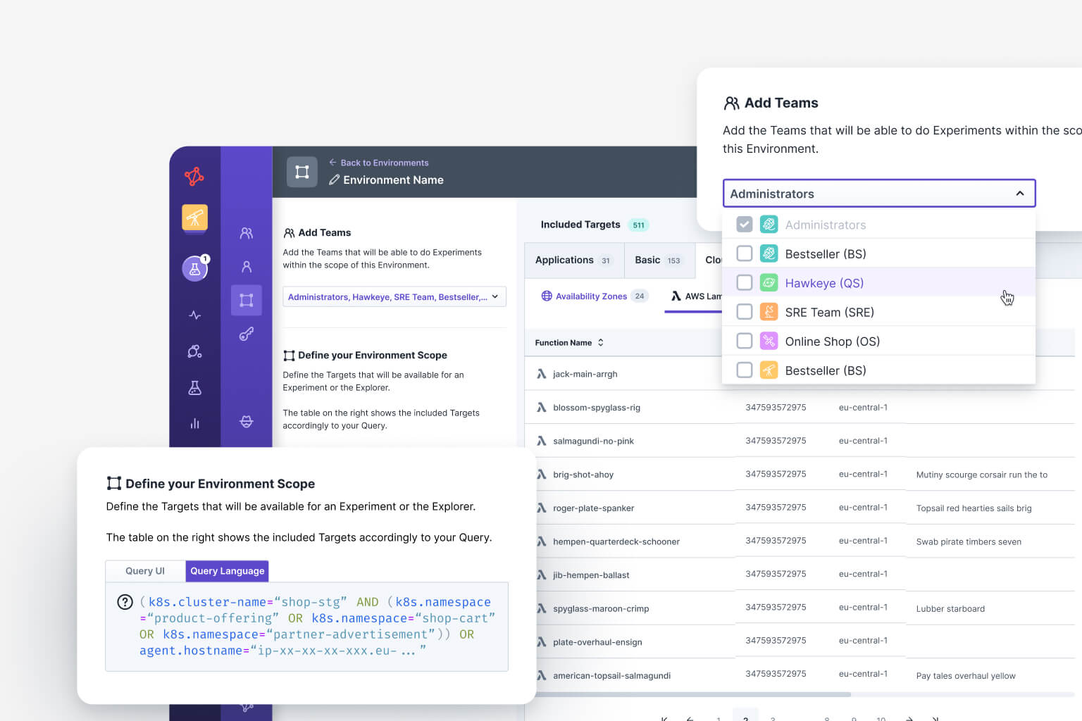 When you install our agent on your network, Steadybit will automatically discover any potential experiment targets and pull in related metadata from your testing environment. Our intuitive query language makes it easy to group and filter your targets however you want.