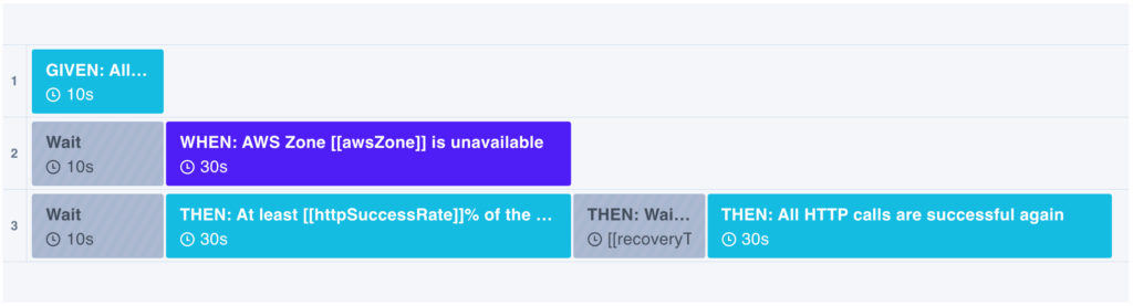 You can see an example of this type of experiment here. The experiment is designed to check that the HTTP request is successful initially before start the blackhole zone attack. There is a wait step to account for recovery time. Then, the HTTP check resumes to ensure that the service has recovered in the amount of time expected: